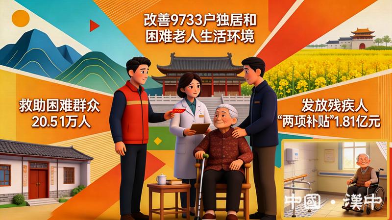 改善9733戶獨居和困難老人生活環境,救助困難群眾20.51萬人,發放殘疾人“兩項補貼”1.81億元。