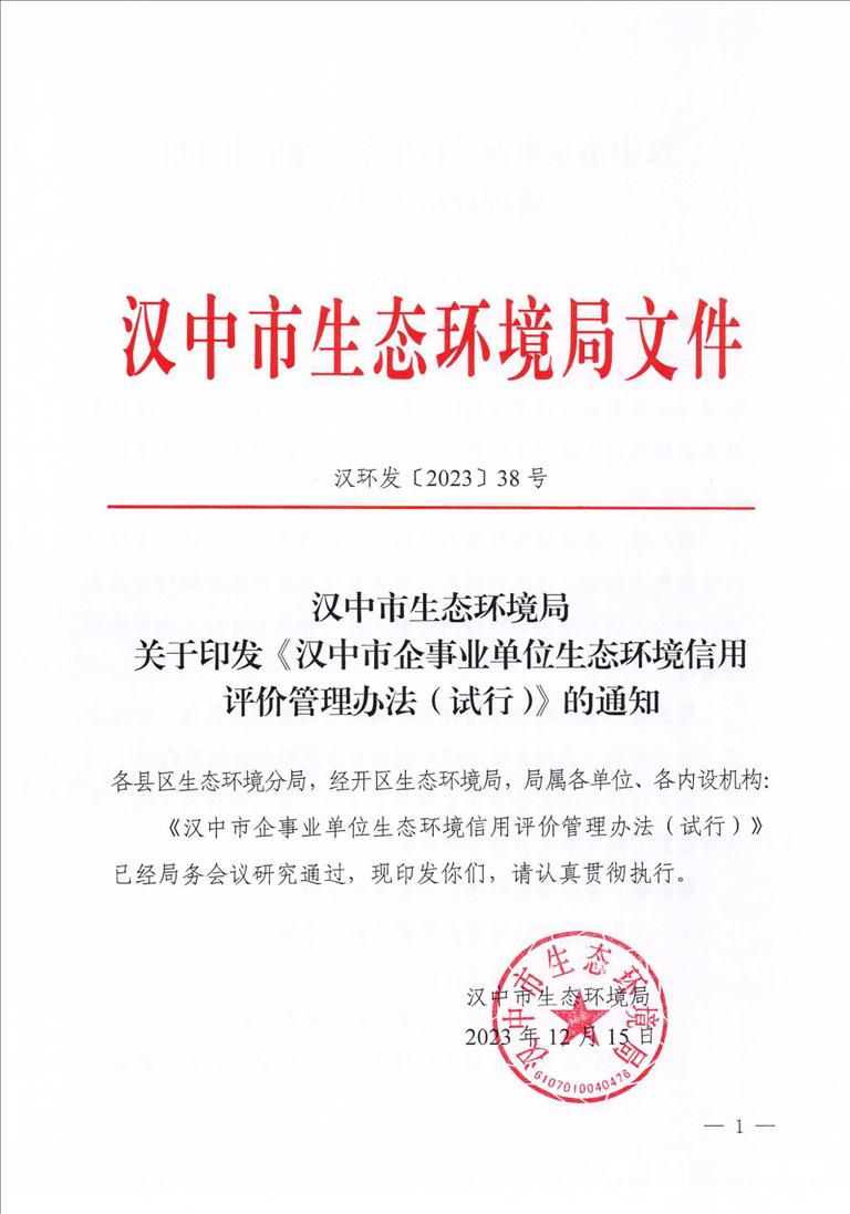 【有效】漢中市生態環境局關于印發《漢中市企事業單位生態環境信用評價管理辦法(試行)》的通知