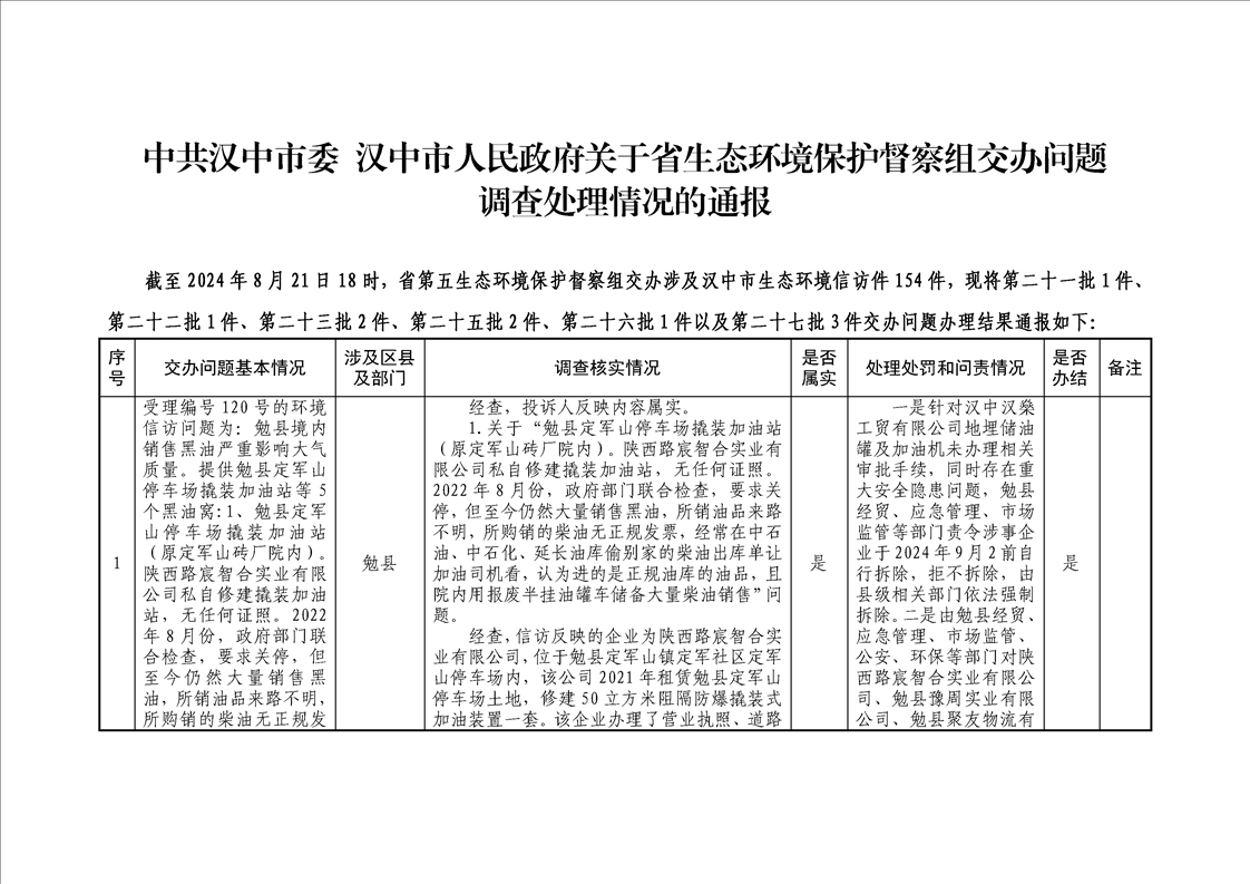 中共漢中市委 漢中市人民政府關(guān)于省生態(tài)環(huán)境保護(hù)督察組交辦問題調(diào)查處理情況的通報(bào)(第二十一批1件、第二十二批1件、第二十三批2件、第二十五批2件、第二十六批1件以及第二十七批3件)