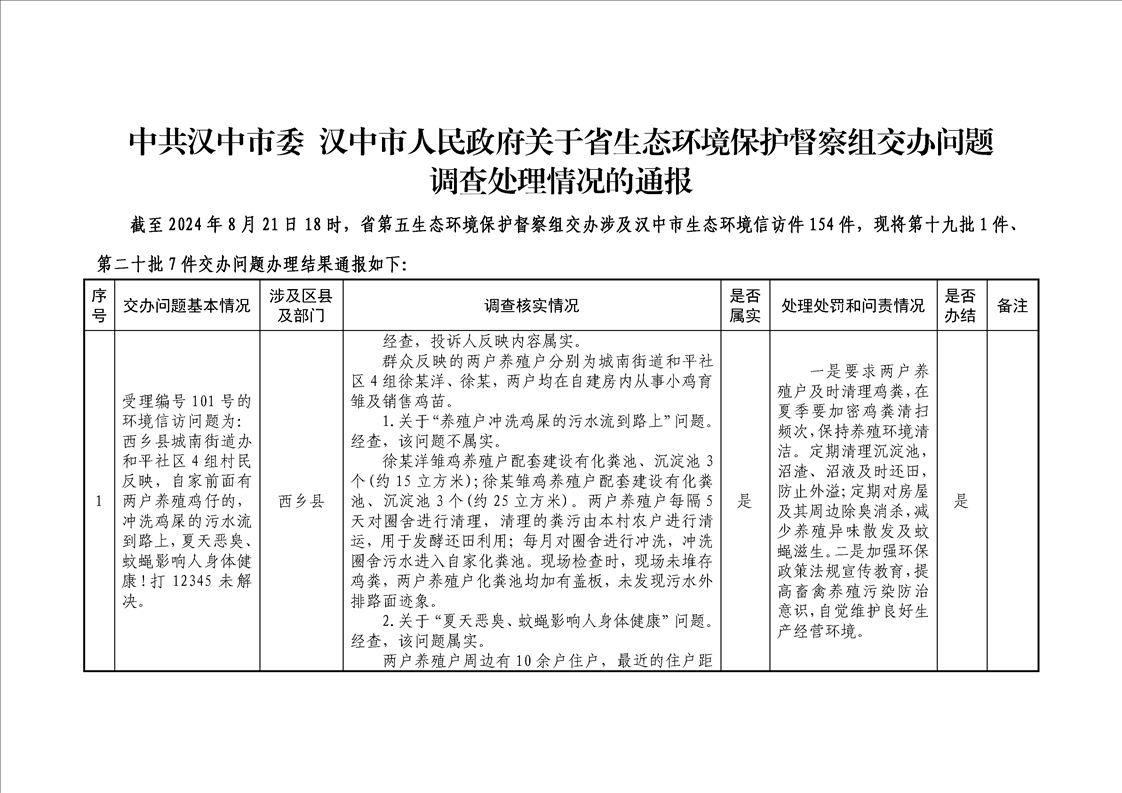中共漢中市委 漢中市人民政府關(guān)于省生態(tài)環(huán)境保護督察組交辦問題調(diào)查處理情況的通報(第十九批1件、第二十批7件)