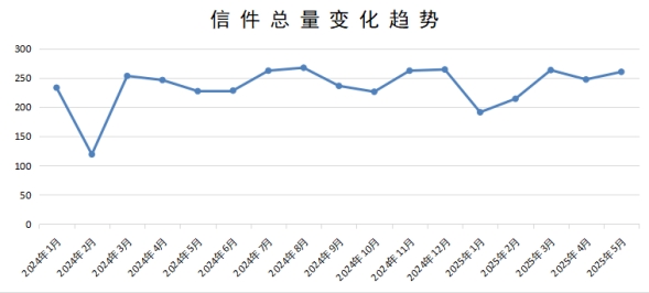 5月,“市長信箱”共收到群眾來信260件。信件總量變化趨勢如下圖所示: