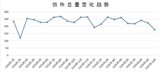 10月,“市長信箱”共收到群眾來信176件。信件總量變化趨勢如下圖所示: