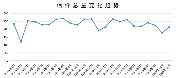11月,“市長信箱”共收到群眾來信213件。信件總量變化趨勢如下圖所示: