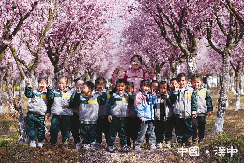 近日,勉縣新街子鎮光華村成片美人梅迎來盛花期,游客們紛紛前來踏青賞景,盡享春光之美。圖為該縣幼兒園老師帶領孩子們在美人梅林春游。