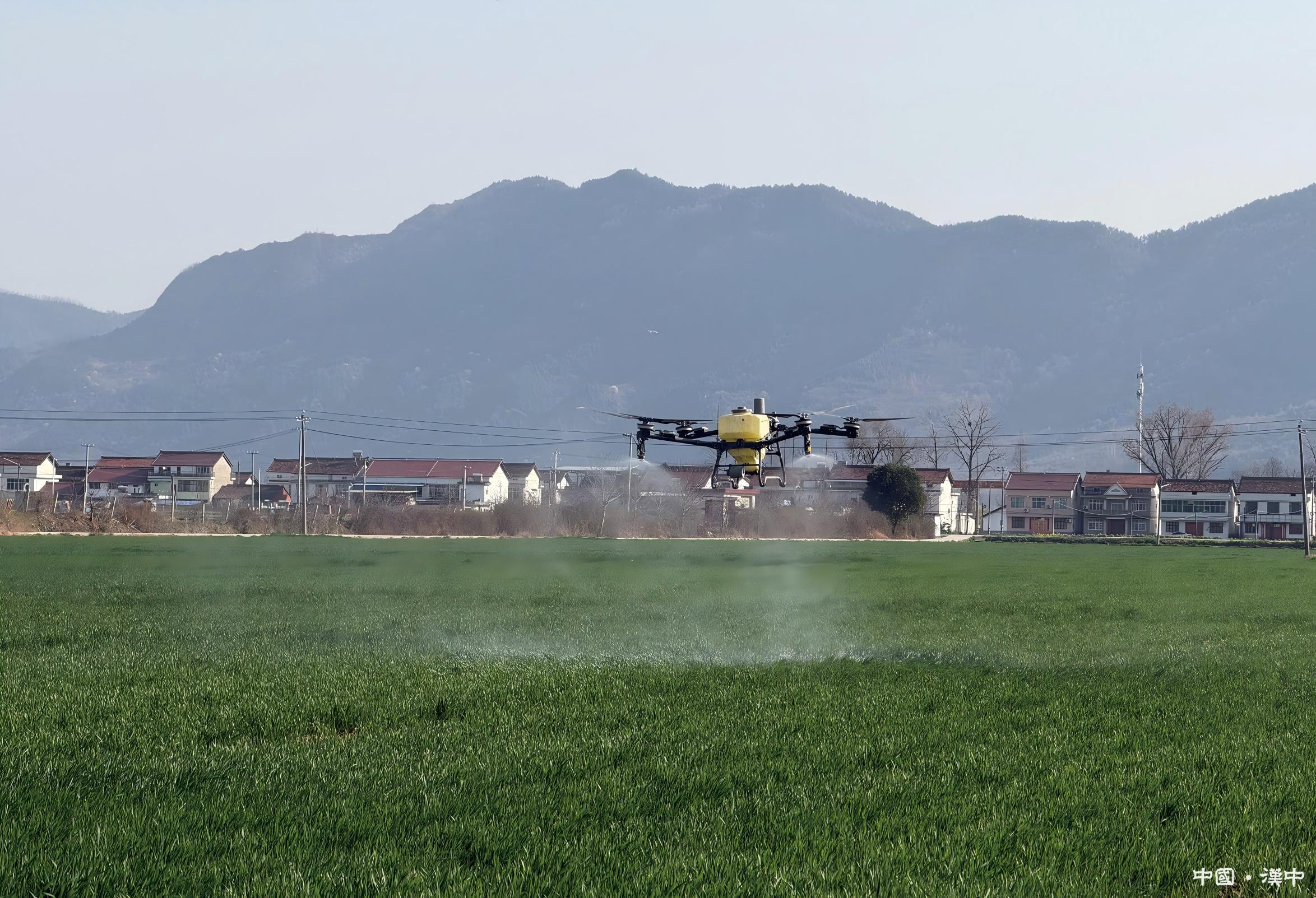 3月5日,在勉縣老道寺鎮(zhèn)侯寨村的小麥種植基地,嫩綠的麥苗隨風(fēng)搖曳,田野仿佛鋪上了一層綠地毯。伴隨著輕微的嗡鳴聲,一架滿載病蟲(chóng)防治藥劑的農(nóng)用無(wú)人機(jī),在技術(shù)人員的操控下騰空而起,沿著預(yù)先設(shè)定的航線掠過(guò)麥田,均勻地將液體肥料撒向田間。