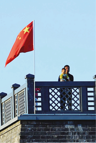 市民與飄揚的五星紅旗合影。  記者劉俊強攝
