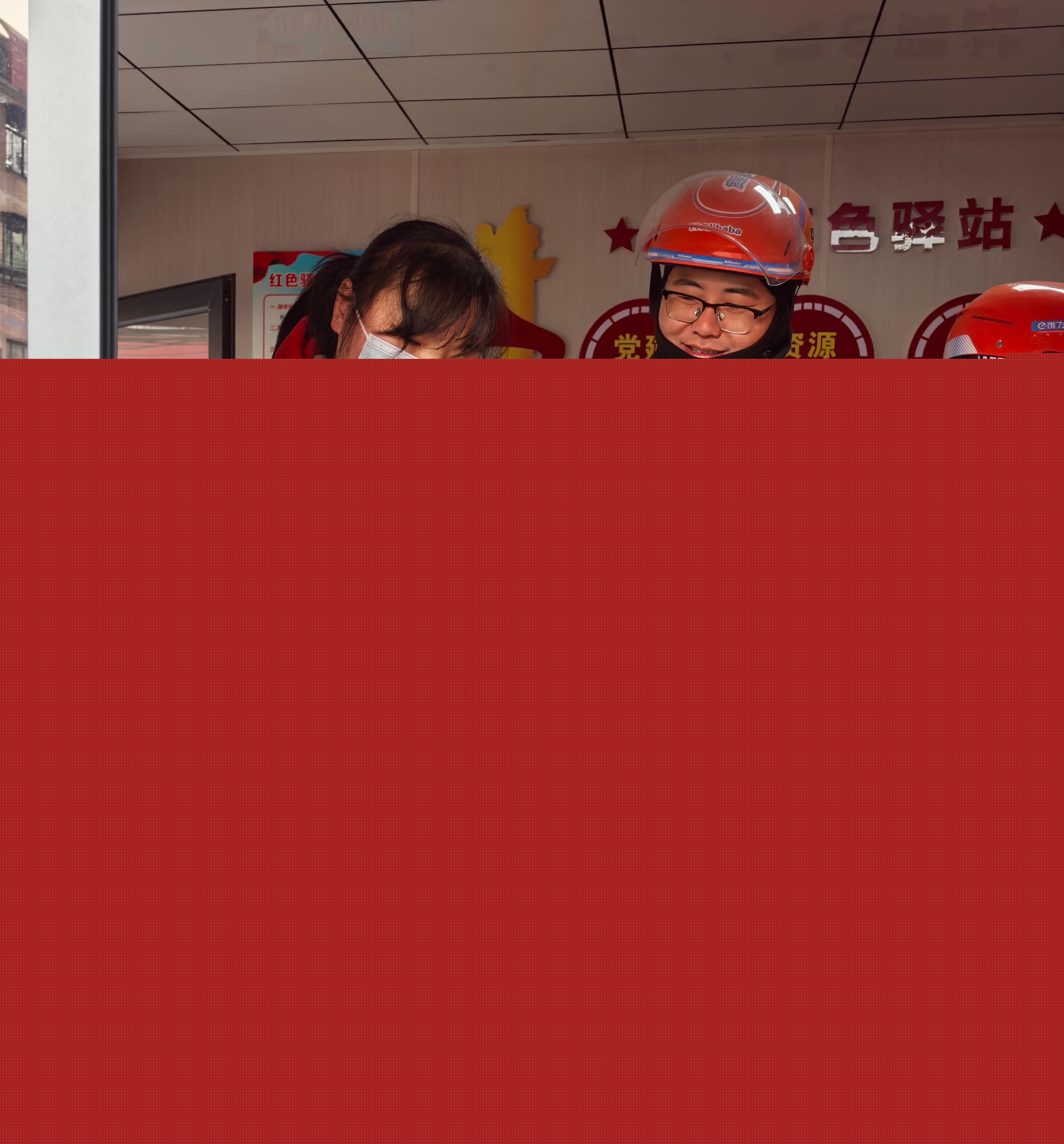 近日,在洋縣朱鹮廣場紅色驛站,社區志愿者為快遞小哥呈上熱乎乎的姜湯茶。