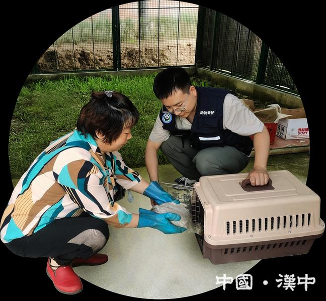 漢中市野生動植物保護管理站的工作人員李超(右一)救助受傷的朱鹮。 (受訪者供圖)