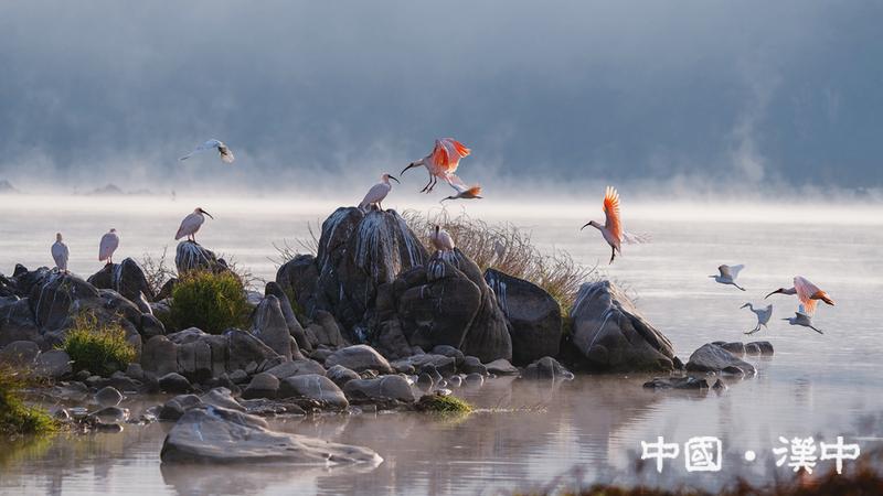 晨霧中,朱鹮翩躚于漢江石灘之上。 (市生態環境局供圖)