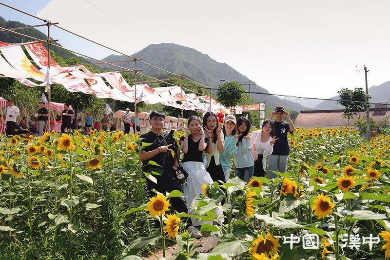 游客在江口鎮(zhèn)梭欏村百畝向日葵花海拍照打卡。