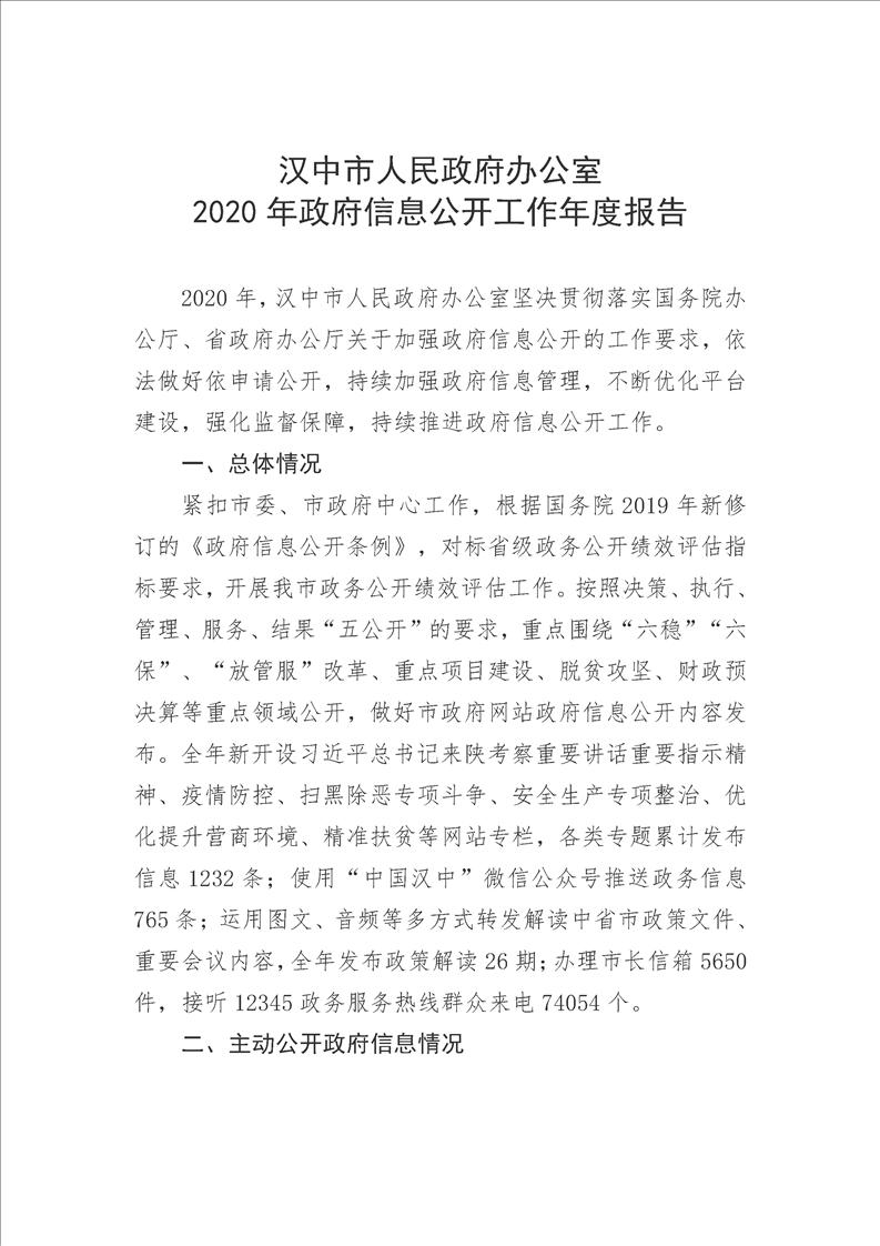 漢中市人民政府辦公室2020年政府信息公開工作年度報告