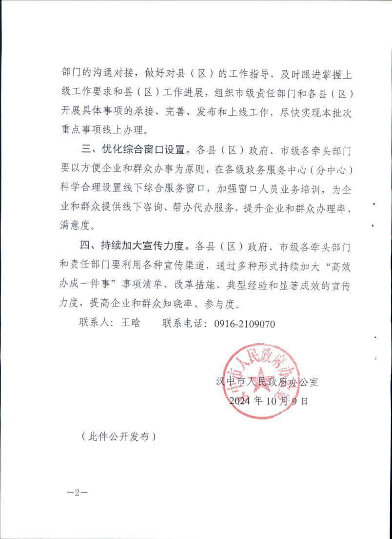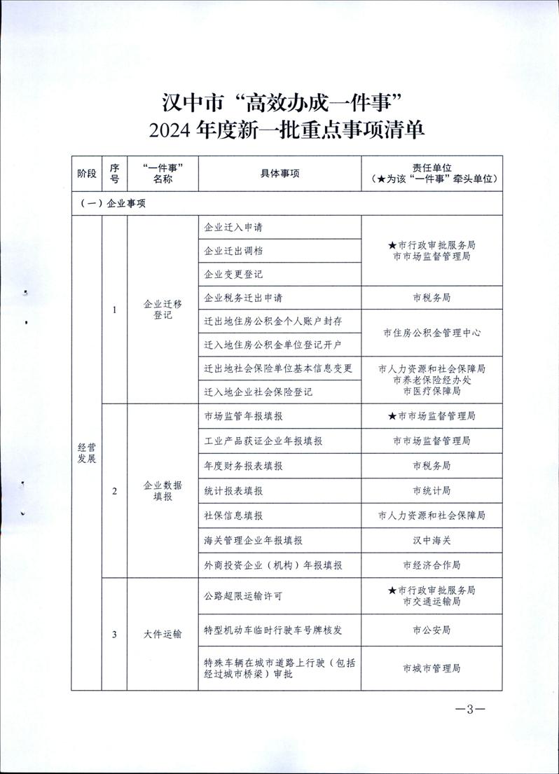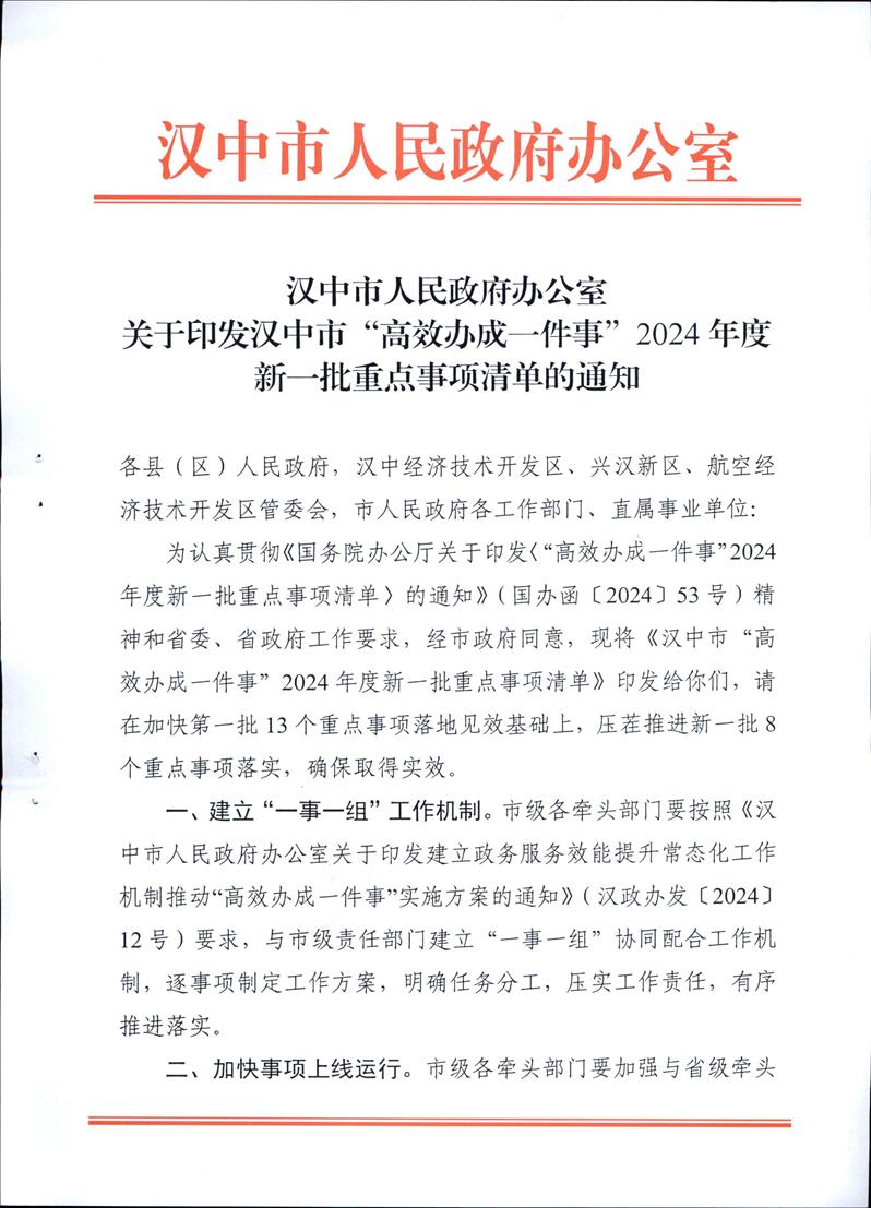 漢中市人民政府辦公室關于印發漢中市“高效辦成一件事”2024年度新一批重點事項清單的通知