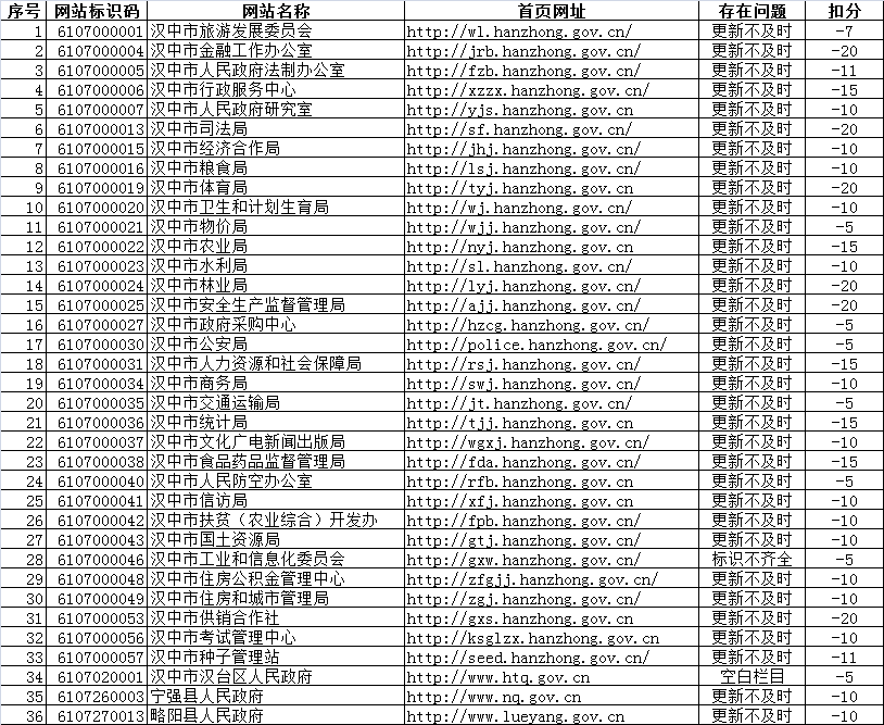 抽查存在主要問題如下。對于抽查出來的問題,漢中市信息辦立即通知相關單位進行了整改,并于11月19日進行了復審,對整改不認真的,將在全市通報批評。
